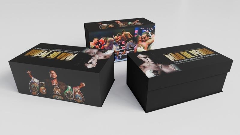 Como parte da proposta premium, os convidados recebem em casa uma caixa personalizada com convite físico e uma luva de boxe autografada por Popó Freitas.